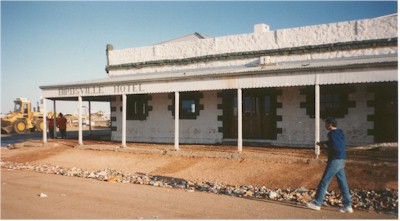 The famous Birdsville Pub with Dave scurrying for a beer Note the beer cans littering the gutter. The front end loader visible on the left of the picture is used to clean up the cans after the races. |