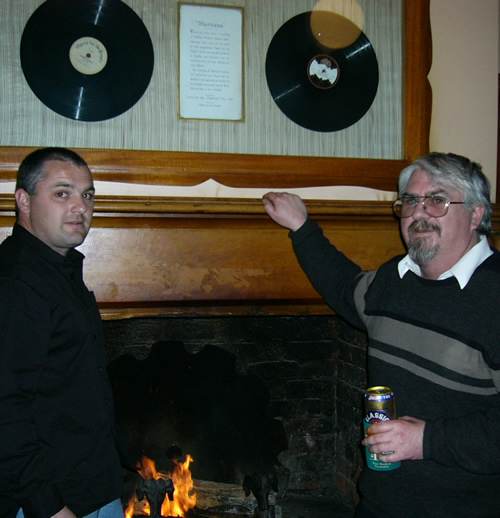 | Bush Inn host Barry Dabin and historian Kim Roberts with the mounted recordings of the 1932 opera Maritana, produced and broadcast from the hotel. |