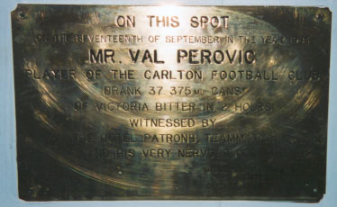 The painting itself was as you would expect, some toffee pom dressed to the hilt and expecting Australians to name their pubs after him because of some event that took place on the other side of the world. We were shaking our heads thinking surely we had moved beyond all that to something more Aussie, when we noticed a plaque on the wall opposite the painting. It read: "ON THIS SPOT, on the seventeenth of September in the year 1984 MR VAL PEROVIC player of the Calton football club, drank 37 375ml cans of victoria bitter in 2 hours. Witnessed by the hotel patrons, teammates and his very nervous dog". It was signed by the then licensee.