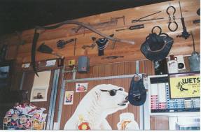 The pub had a quaint rustic feel and a fair bit of character. There was a great assortment of farm tools and other memorabilia on the walls, covering them from floor to ceiling. We noted that the pub seemed to have the complete series of prints of gambling dogs (the sine quo non of any Aussie home bar!). The tool collection included an interesting one labelled “Irish Chainsaw” which can be seen in the picture below:
