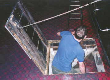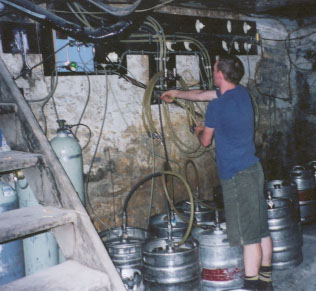 We continued downstairs, into a sort of converted cellar-cum-nightclub. Chris explained that they closed the pub down in the afternoon, and reopened it at night. "If we keep it open all the day-drinkers, typically old men, stay in. This can scare the night crowd off". By this time a worker had arrived to officially open the pub for the evening (we were being given a 'special' tour). The first thing this involved was setting up the kegs. Being interested in all things beer, we followed the worker down the trapdoor and into the bowels of the GB. We always wondered how it worked....