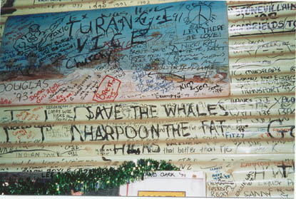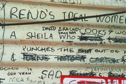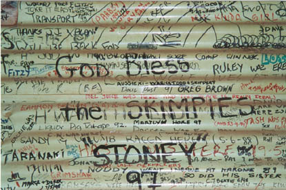 We wandered into the side room. In stark contrast to the main area of the pub, it was scrawl free. On closer inspection, it became obvious why - the room was set up as a remembrance shrine for people who had been killed in the mines. Quite sad really, reading laments for old mates. There was also some background material regarding the town itself. An old gold mining town dating back to 1896, its population had peaked in 1901 at 15,000. By 1933 this had been reduced to 130. By 1999 this had been reduced to 10. We were drinking in a pub in a 100 year old mining town of population 10. Many many miles from anywhere. No wonder people seemed, well, a little rough around the edges.