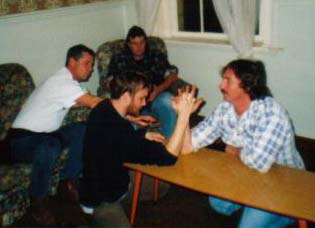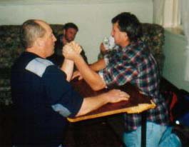 This was obviously normal procedure because within minutes the room had been cleared and the locals were challenging each other in arm wrestling competitions. We immediately had a flash back to our tour of the Boags brewery in which the guide had pointed to the Strong Arm logo and stated, somewhat clinically, that "arm wrestling used to be quite a popular pastime in pubs about 100 years ago". In some places, as it turns out, time stands still. Before we knew it, us soft city folk were talking on these hard as buggery loggers in their national sport. You little beauty.